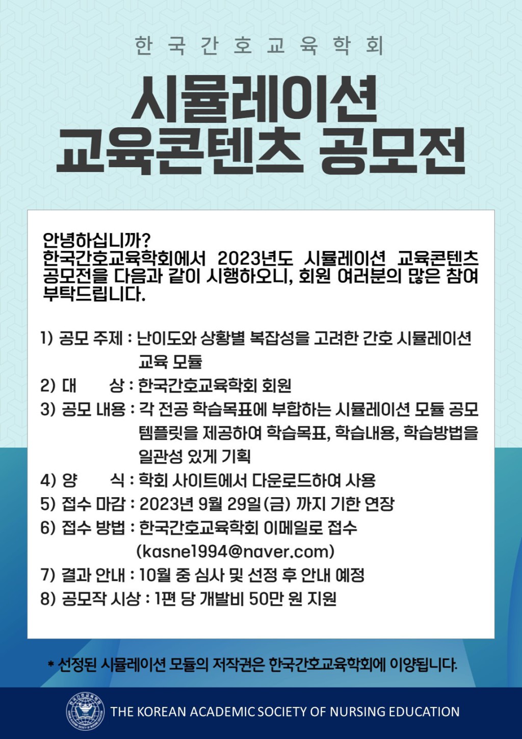 본 한국간호교육학회에서는 다음과 같이 2023년 시뮬레이션 교육콘텐츠 공모전을 시행하오니, 많은 참여 부탁드립니다.