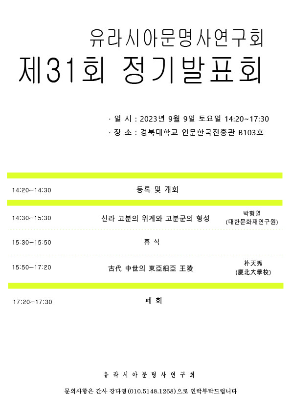 2023년 9월 9일 토요일, 유라시아문명사연구회 제31회 정기발표회가 진행될 예정입니다.