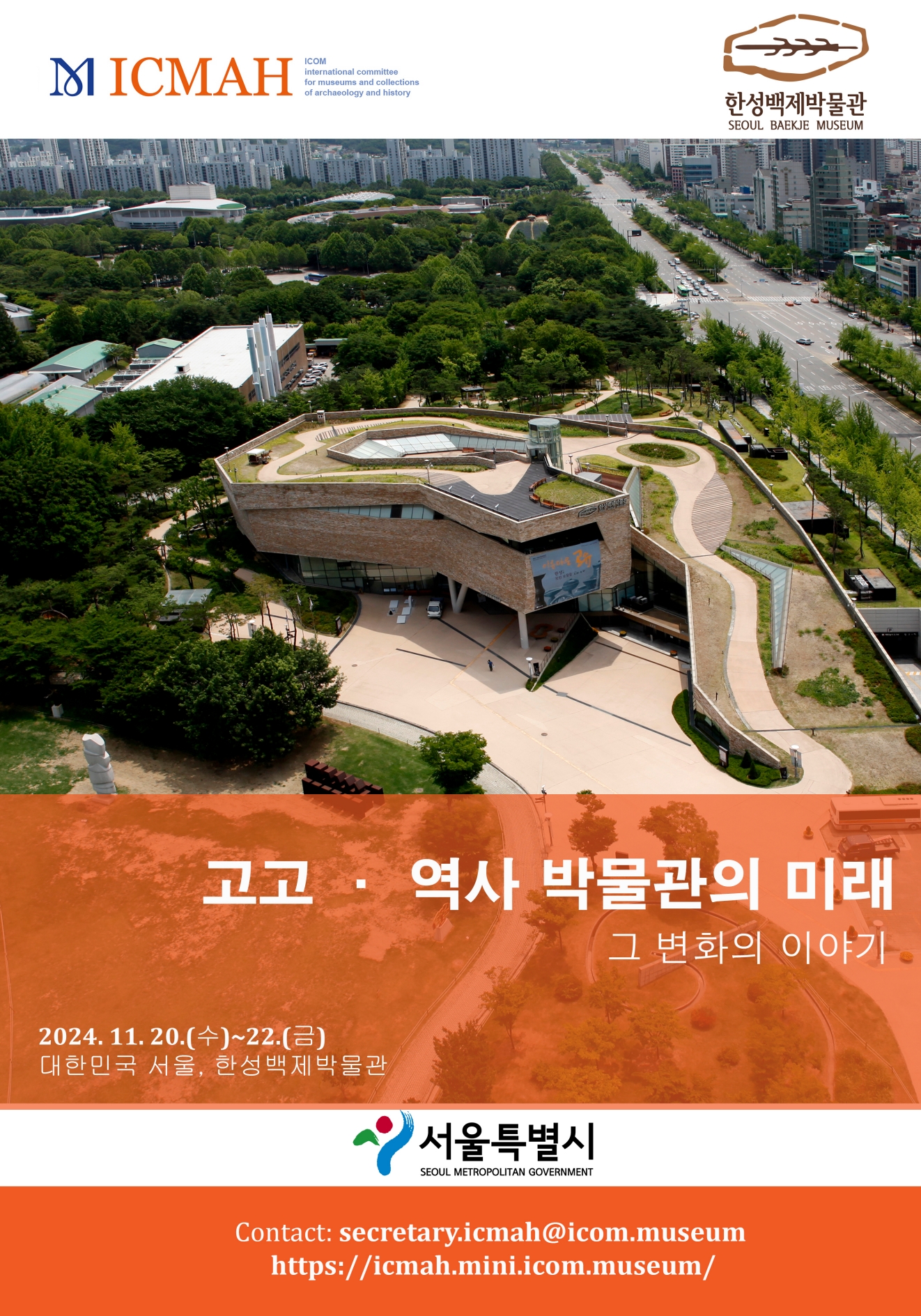 2024 ICOM ICMAH 국제학술회의가 11월 20일~22일 서울 한성백제박물관에서 개최됩니다. ICOM-ICMAH(국제고고학역사박물관위원회)는 매년 세계 각국의 고고학 및 역사와 관련된 수집품과 박물관과 관련된 학술회의를 개최해왔습니다. 이번 학술회의는 "고고·역사 박물관의 미래"라는 주제로 ICOM-ICMAH와 서울특별시, 한성백제박물관이 공동주최합니다.