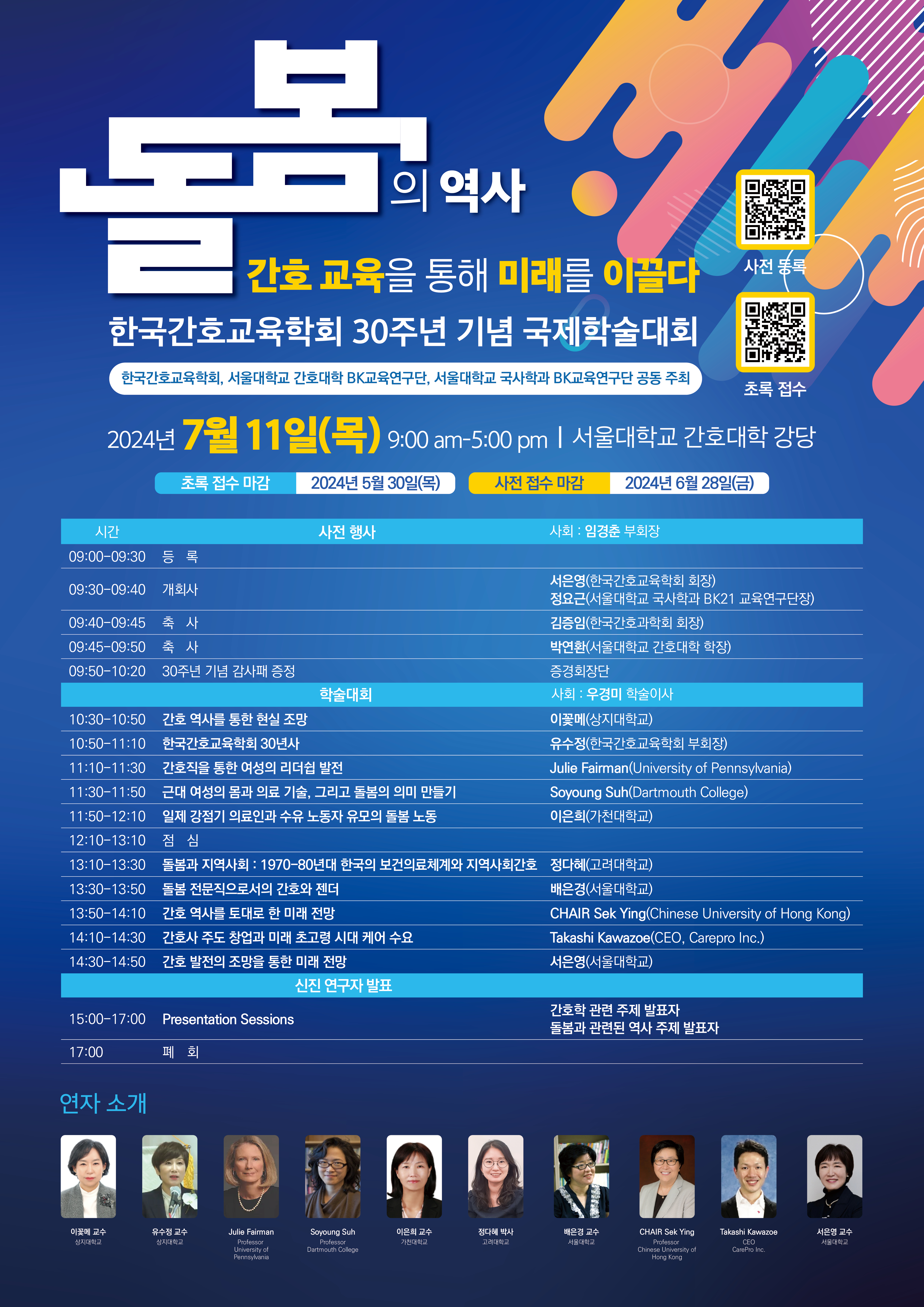 1.주 제 : '돌봄의 역사: 간호교육을 통해 미래를 이끌다' 2.일 시 : 2024년 7월 11일 (목) 09:00~17:00 3.장 소 : 서울대학교 간호대학 강당 (서울특별시 종로구 대학로 103) |