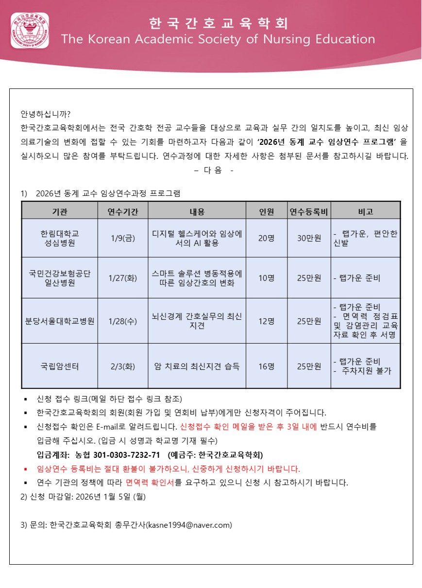 [한국간호교육학회] 2026년도 동계교수임상연수과정 안내