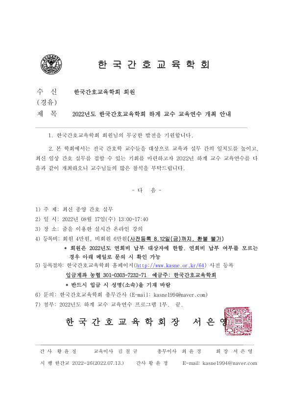 2022년도 한국간호교육학회 하계 교수 교육연수를 다음과 같이 개최예정입니다.