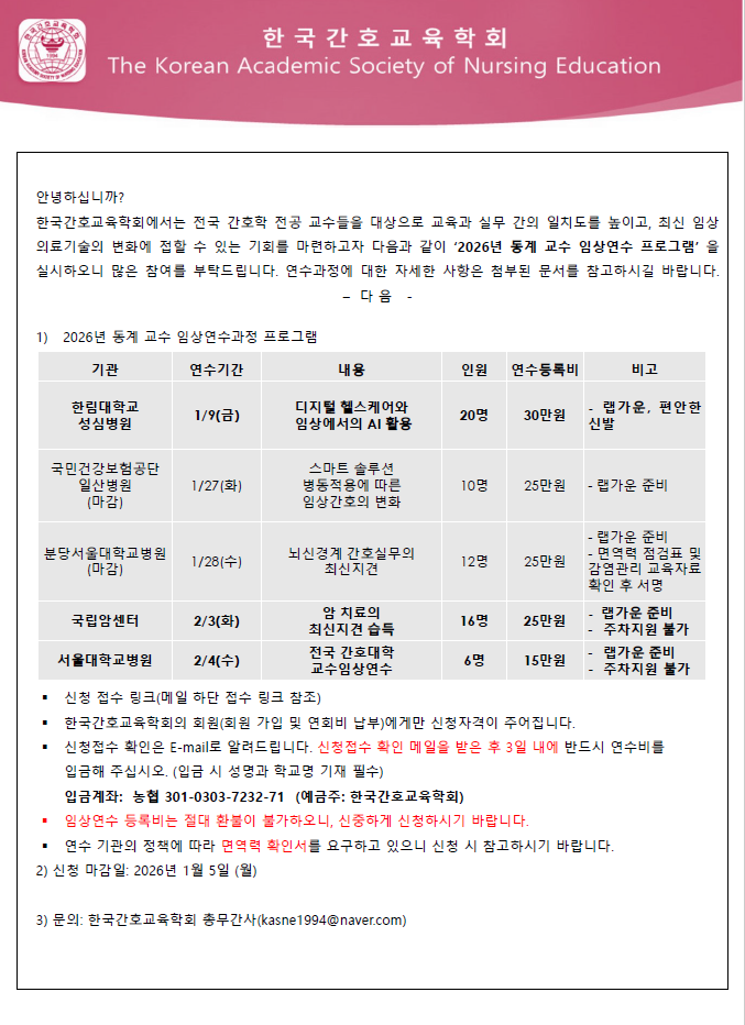 2/4 (수) 서울대학교병원 '전국 간호대학 교수임상연수'과정이 신설되어 안내문 및 프로그램 수정본을 게시하오니 한국간호교육학회 회원님의 많은 참여 부탁드립니다